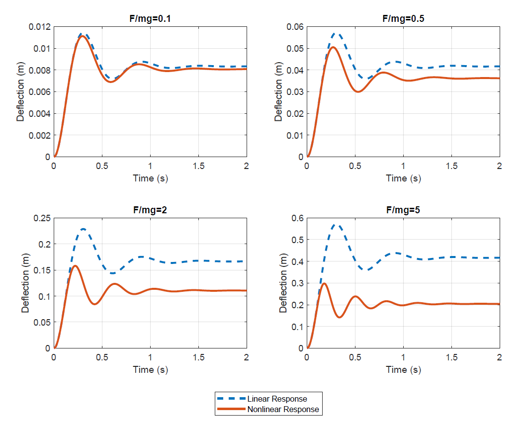 The linear and nonlinear equations of motion were simulated for \(F/mg =\) 0.1, 0.2, 2.0, and 5.0. The results of these simulations are shown below. In all cases, the linearized model overestimated the system's displacement. This is because the actual spring force increased much more rapidly than the spring force of the linearized model (specifically, cubic growth vs. linear growth). Additionally, the linearized model kept a constant natural frequency, while the response frequency of the nonlinear system increased with displacement. Again, this discrepancy is due to the linearized model not accounting for the actual system's increasing stiffness.