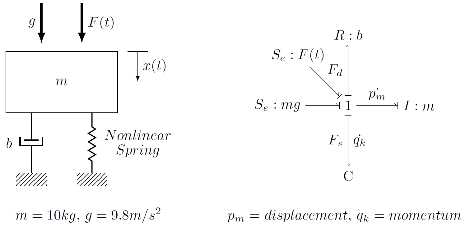 Figure 1: Mechanical Schematic of Nonlinear System (left) and equivalent bond graph (right).