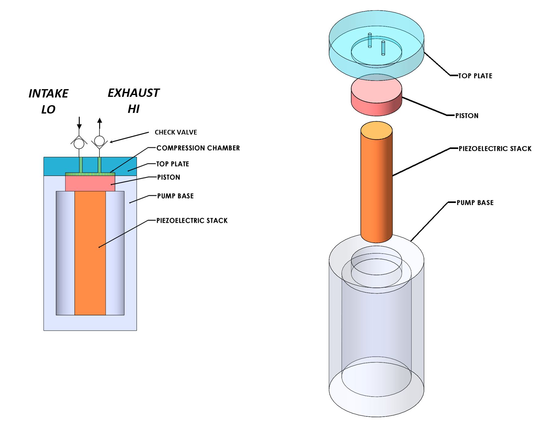 In this project, you will model a positive displacement piston pump powered by a piezoelectric stack actuator. The piezoelectric actuator will be driven by a sinusoidal voltage at a frequency of approximately 1kHz. The pump will consist of a single piston moving axially in a frictionless bore. Your simulation will include the mass and stiffness of the pump housing, piston, and fluid, as well as pressure losses from flow resistance. This study will examine how elements of mechanical design are driven by the properties and limitations of real materials. An effective model will aid in the identification of design criteria that will drive the selection of materials, and the geometry of the final product.